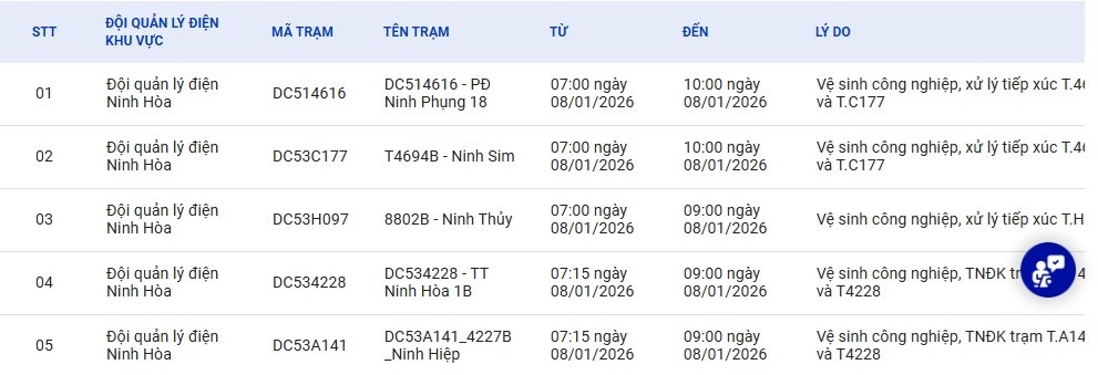 | 3 | Đội quản lý điện Ninh Hòa | DC53H097 | 8802B - Ninh Thủy | 07:00 08/01/2026 | 09:00 08/01/2026 | Vệ sinh công nghiệp, xử lý tiếp xúc T.H097 | Đã duyệt |
