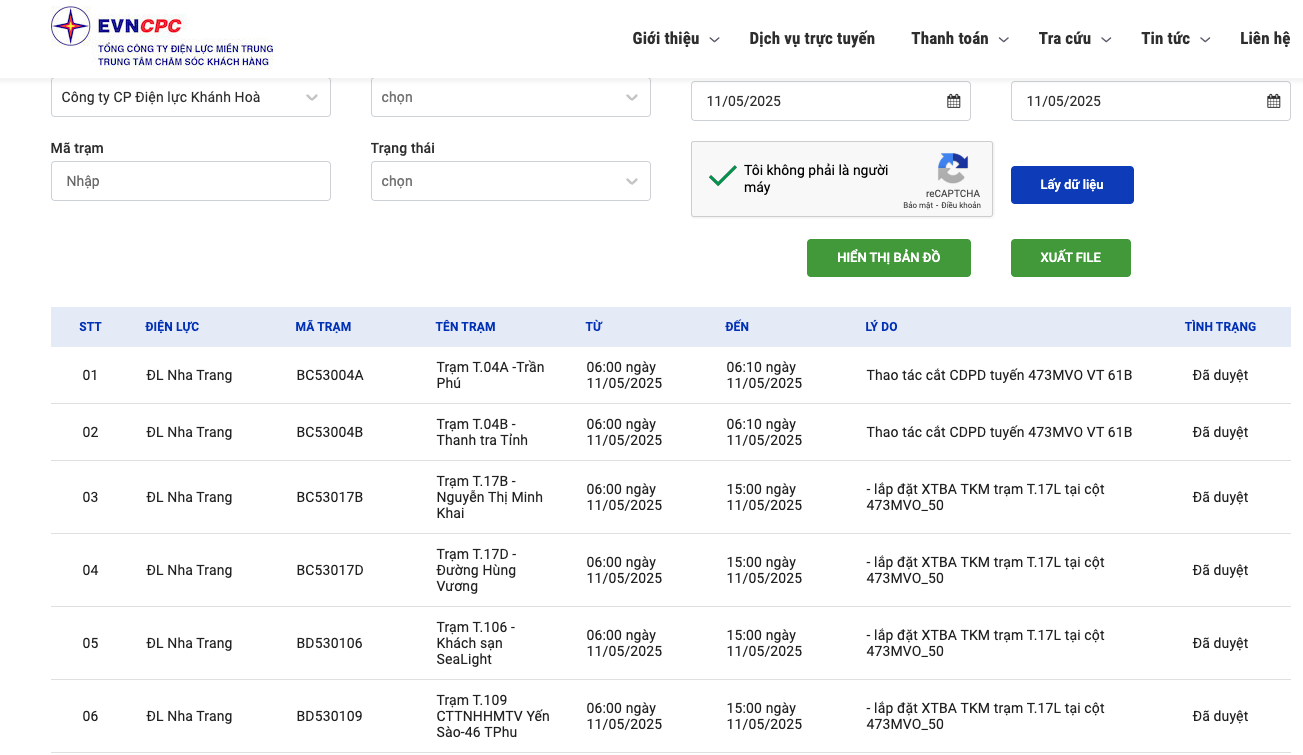 | ĐL Nha Trang | BD530220 | Trạm T.220 Khách sạn Hải Yến | 11/5/25 6:00 | 11/5/25 6:10 | Thao tác cắt CDPD tuyến 473MVO VT 61B | Đã duyệt |