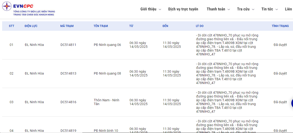 | ĐL Ninh Hòa | DC524809 | PĐ Ninh quang 03 | 06:30 14/05/2025 | 16:00 14/05/2025 | Cải tạo thay dây trạm T.4809 | Đã duyệt |
