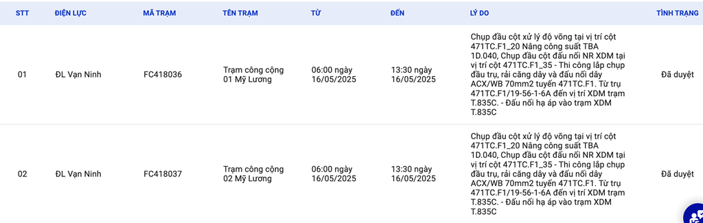 | 1 | ĐL Vạn Ninh | FC418036 | Trạm công cộng 01 Mỹ Lương | 06:00 16/05/2025 | 13:30 16/05/2025 | Chụp đầu cột xử lý độ võng tại vị trí cột 471TC.F1_20