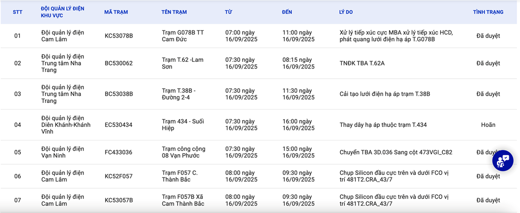 | 7 | Đội quản lý điện Cam Ranh-Khánh Sơn | CD53340A | 030340A--|--nhà ga san bay | 23:30 16/09/2025 | 23:59 16/09/2025 | Chuyển lưới trung áp | Đã duyệt |