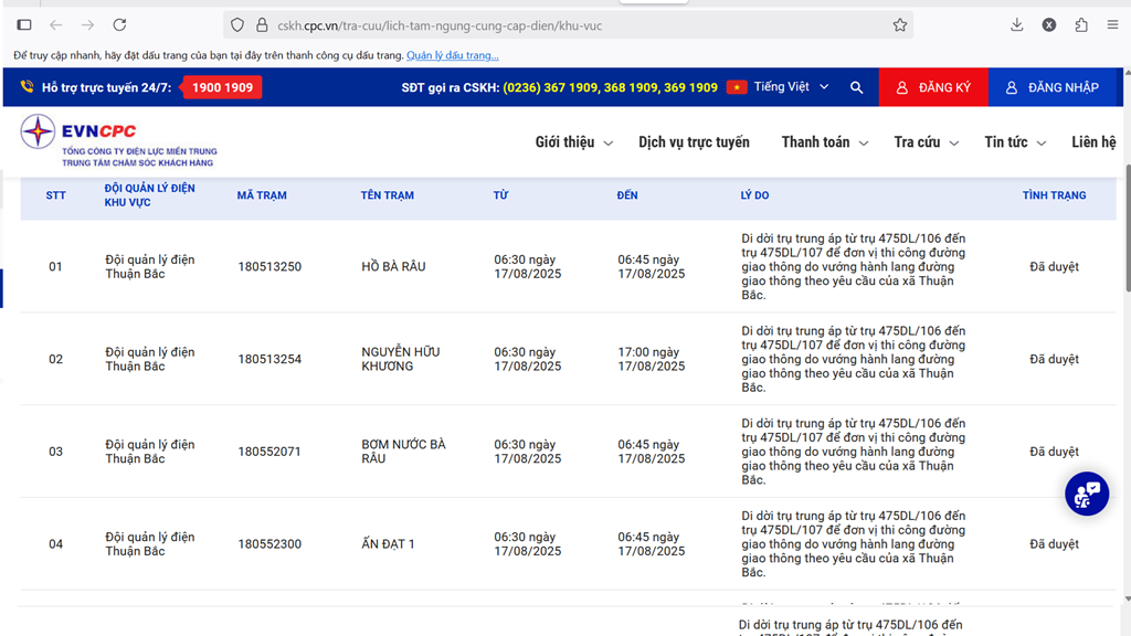 | Đội quản lý điện Thuận Bắc | 180.552.932 | THÀNH TRUNG | 06:30 17/08/2025 | 17:00 17/08/2025 | Di dời trụ trung áp từ trụ 475DL/106 đến trụ 475DL/107 để đơn vị thi công đường giao thông do vướng hành lang đường giao thông theo yêu cầu của xã Thuận Bắc. | Đã duyệt |