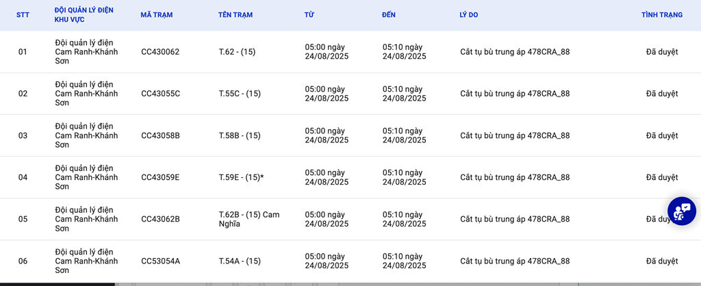 | 6 | Đội quản lý điện Cam Ranh-Khánh Sơn | CC53054A | T.54A - (15) | 05:00 24/08/2025 | 05:10 24/08/2025 | Cắt tụ bù trung áp 478CRA_88 | Đã duyệt |