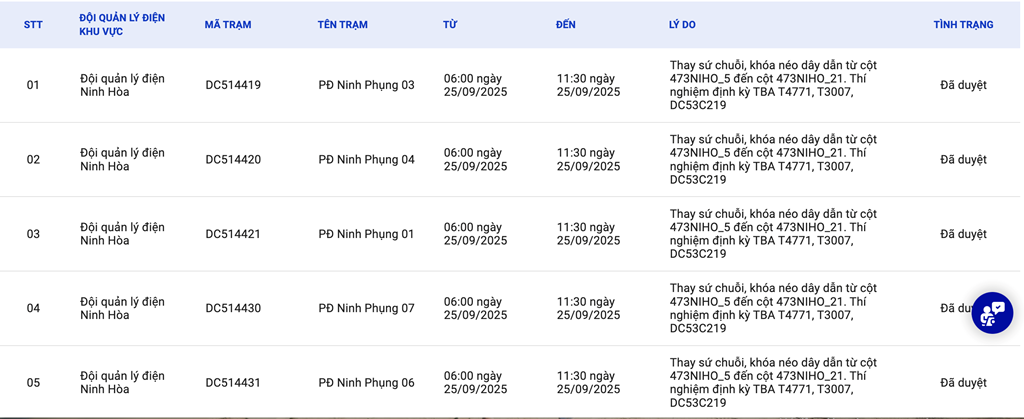 | 10 | Đội quản lý điện Ninh Hòa | DC633007 | Ninh Phụng | 06:00 25/09/2025 | 11:30 25/09/2025 | Thay sứ chuỗi, khóa néo dây dẫn từ cột 473NIHO_5 đến cột 473NIHO_21.