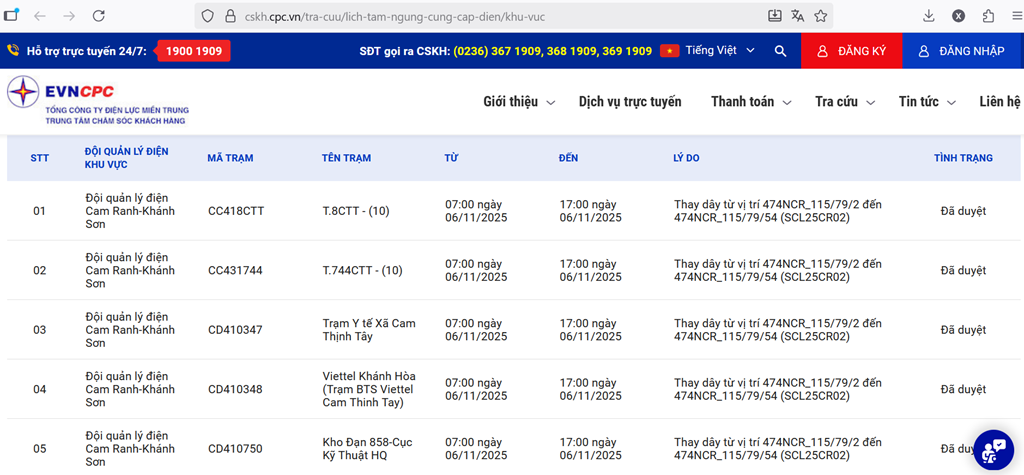 | 19 | Đội quản lý điện Cam Ranh-Khánh Sơn | CC43123B | T.123B - (10)# | 07:30 06/11/2025 | 17:00 06/11/2025 | Thay dây hạ áp lộ A trạm T123B (SCL25CR11) | Đã duyệt |