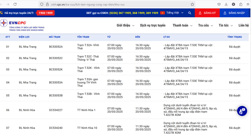 | ĐL Nha Trang | BC53041P | Trạm T.41P - Ngọc Hiệp | 10:30 20/05/2025 | 11:15 20/05/2025 | TNĐK TBA T.41P | Đã duyệt |
