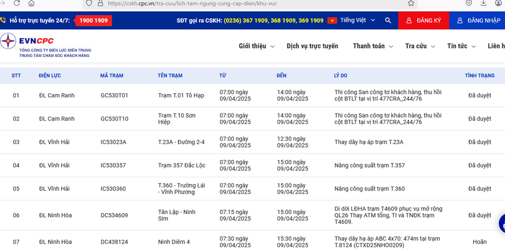 ĐL Cam Ranh GC530T01 Trạm T.01 Tô Hạp 07:00 09/04/2025 14:00 09/04/2025 Thi công San công tơ khách hàng, thu hồi cột BTLT tại vị trí 477CRA_244/76 Đã duyệt