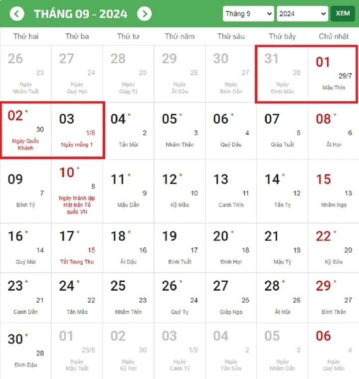 Lịch nghỉ lễ Quốc khánh 2/9 năm 2024. (Ảnh chụp màn hình)