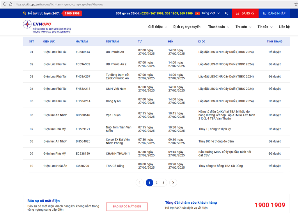 | 8 | Điện lực An Nhơn | BH534025 | Cơ sở SX Đá Viên Nhơn Phong | 07:30 27/02/2025 | 09:10 27/02/2025 | Thay ĐK hệ thống đo đếm | Đã duyệt |