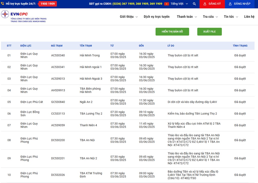 | 4 | Điện Lực Quy Nhơn | AH539913 | TBA Biên phòng Hải Minh | 07:00 03/06/2025 | 16:30 03/06/2025 | Thay bulon cột bị rit sét | Đã duyệt |