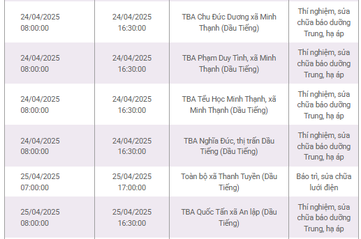 | 24/04/2025 08:00:00 | 24/04/2025 16:30:00 | TBA Nghĩa Đức, thị trấn Dầu Tiếng (Dầu Tiếng) | Thí nghiệm, sửa chữa bảo dưỡng Trung, hạ áp |