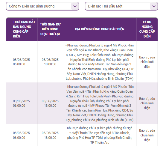 | 08/06/2025 06:00:00 | 08/06/2025 18:00:00 | Khu vực đường Phú Lợi bên phải đường từ Ngã tư Mỹ Phước Tân vạn đến ngã 3 Tân Khánh, phường Phú Hòa,TP TDM, phường Bình Chuẩn, TP Thuận An. | Bảo trì, sửa chữa lưới điện |