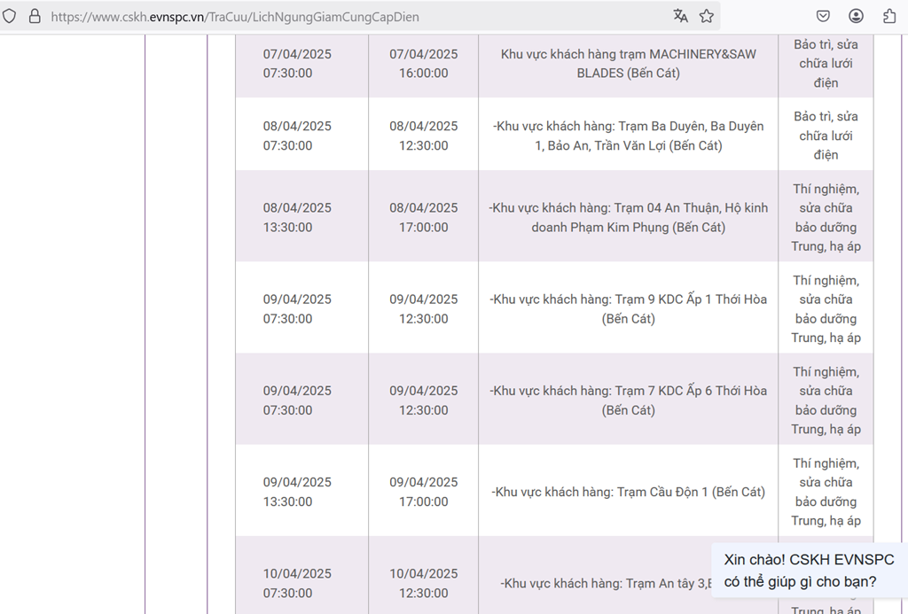 | Bến Cát | 07/04/2025 07:30:00 | 07/04/2025 16:00:00 | Khu vực khách hàng trạm MACHINERY&SAW BLADES (Bến Cát) | Bảo trì, sửa chữa lưới điện |