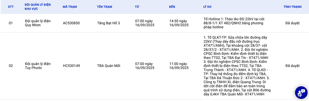 | 2 | Đội quản lý điện Tuy Phước | HC530149 | TBA Quán Mối | 07:00 16/09/2025 | 11:00 16/09/2025 | 1. Tổ QLKT-TP: Sửa chữa lớn đường dây 22kV (Thay dây đấu nối đường trục XT471/ANH), Tại khoảng cột 28/37- cột 28/37/2 - XT471/ANH.