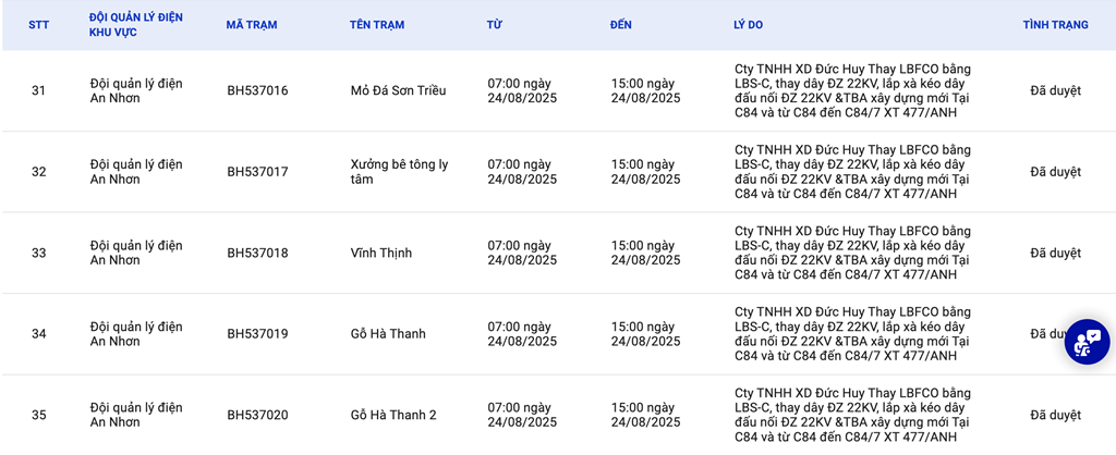 | 1 | Đội quản lý điện An Nhơn | BH537016 | Mỏ Đá Sơn Triều | 07:00 24/08/2025 | 15:00 24/08/2025 | Cty TNHH XD Đức Huy Thay LBFCO bằng LBS-C, thay dây ĐZ 22KV, lắp xà kéo dây đấu nối ĐZ 22KV &TBA xây dựng mới Tại C84 và từ C84 đến C84/7 XT 477/ANH | Đã duyệt |