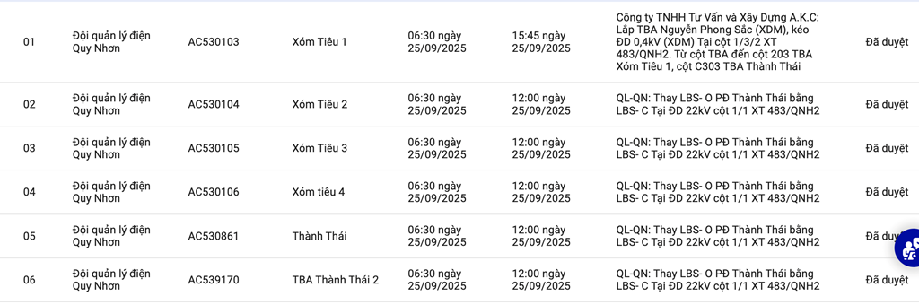 | 3 | Đội quản lý điện Quy Nhơn | AC530105 | Xóm Tiêu 3 | 06:30 25/09/2025 | 12:00 25/09/2025 | QL-QN: Thay LBS- O PĐ Thành Thái bằng LBS- C Tại ĐD 22kV cột 1/1 XT 483/QNH2 | Đã duyệt |