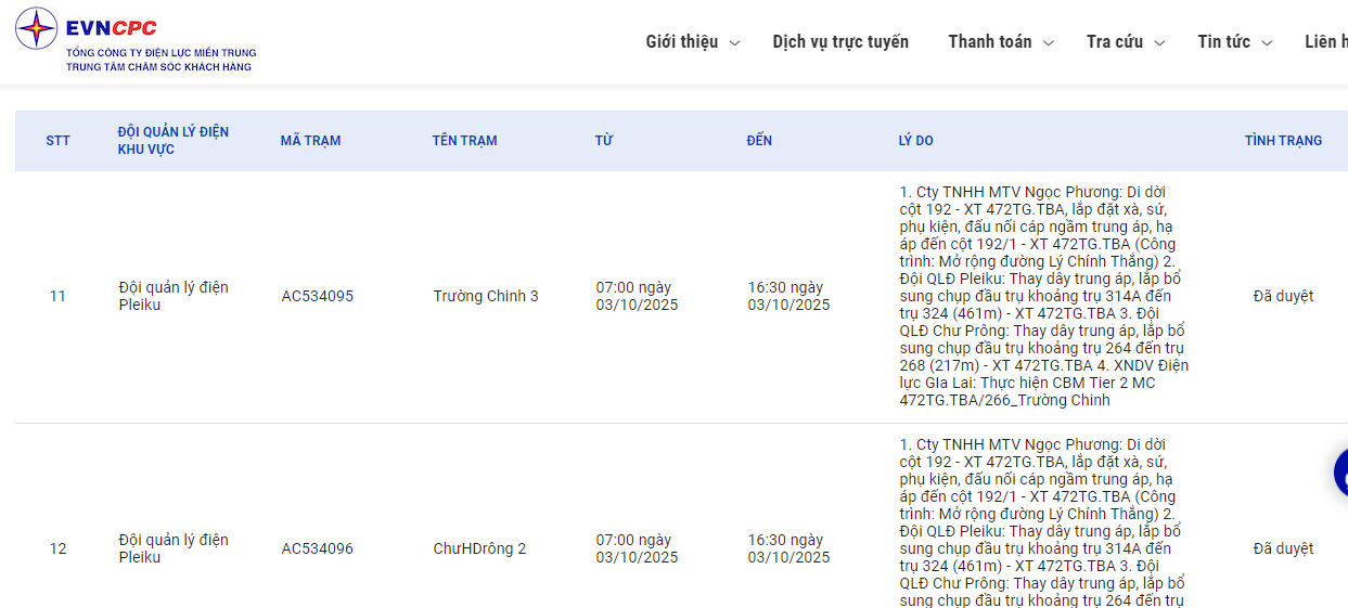 | Đội quản lý điện Pleiku | AC534094 | Trường Chinh 2 | 07:00 03/10/2025 | 16:30 03/10/2025 | 1. Cty TNHH MTV Ngọc Phương: Di dời cột 192 - XT 472TG.TBA, lắp đặt xà, sứ, phụ kiện, đấu nối cáp ngầm trung áp, hạ áp đến cột 192/1 - XT 472TG.TBA