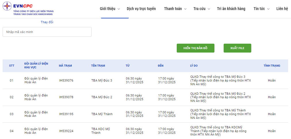 | Đội quản lý điện Hoài Ân | IH539195 | TBA Mỹ Thành | 06:30 31/12/2025 | 17:00 31/12/2025 | QLKD:Thay thế công tơ TBA Mỹ Thành (Tiếp nhận lưới điện hạ áp nông thôn HTX NN Ân Mỹ) | Hoãn |