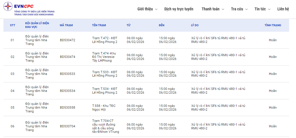 | Đội quản lý điện Trung tâm Nha Trang | BD530534 | Trạm T.534 - KĐT Lê Hồng Phong 2 | 06:00 06/02/2026 | 15:00 06/02/2026 | Xử lý rò rỉ khí SF6 tủ RMU 480-1 vả tủ RMU 480-2 | Hoãn |