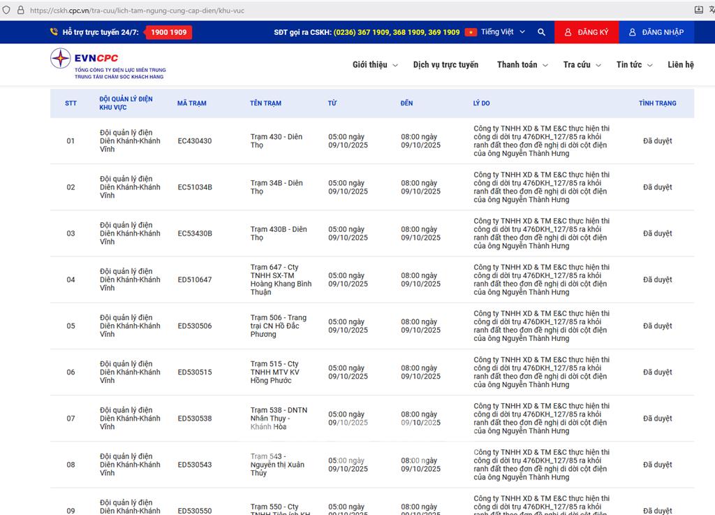 | 5 | Đội quản lý điện Diên Khánh-Khánh Vĩnh | ED530506 | Trạm 506 - Trang trại CN Hồ Đắc Phương | 05:00 09/10/2025 | 08:00 09/10/2025 | Công ty TNHH XD & TM E&C thực hiện thi công di dời trụ 476DKH_127/85 ra khỏi ranh đất theo đơn đề nghị di dời cột điện của ông Nguyễn Thành Hưng | Đã duyệt |