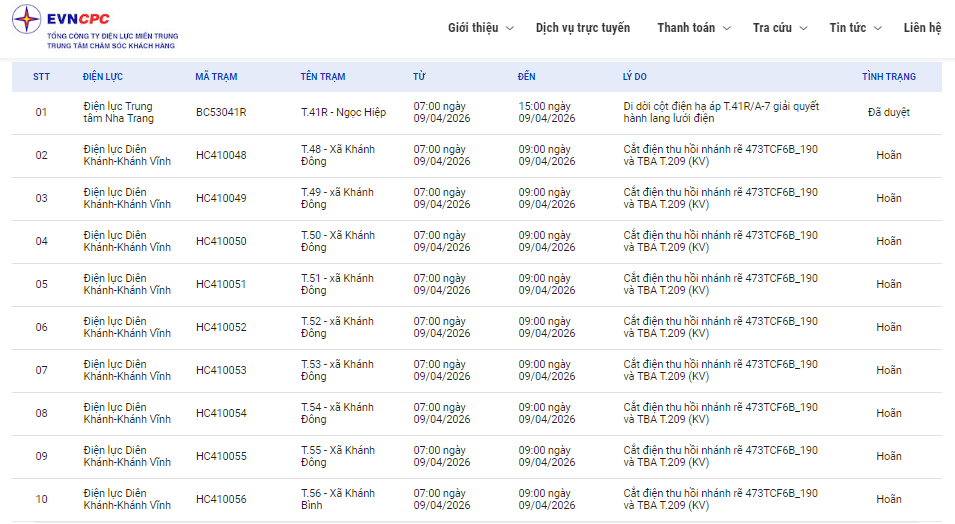 | Điện lực Diên Khánh-Khánh Vĩnh | HC410050 | T.50 - Xã Khánh Đông | 07:00 09/04/2026 | 09:00 09/04/2026 | Cắt điện thu hồi nhánh rẽ 473TCF6B_190 và TBA T.209 (KV) | Hoãn |