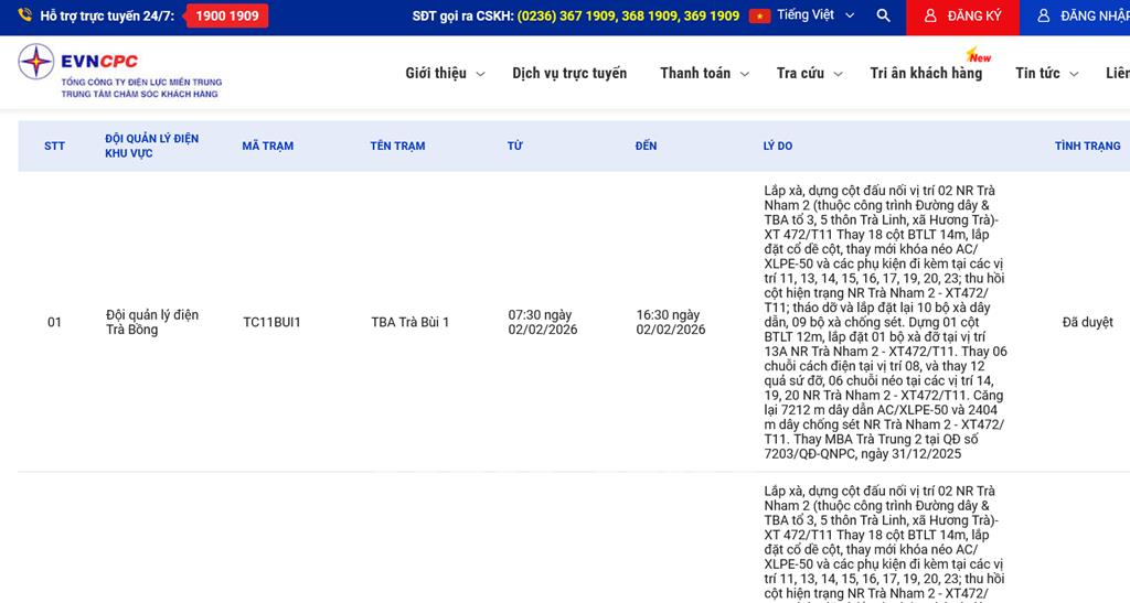 | 2 | Đội quản lý điện Trà Bồng | TC11BUI2 | TBA Trà Bùi 2 | 07:30 02/02/2026 | 16:30 02/02/2026 | Lắp xà, dựng cột đấu nối vị trí 02 NR Trà Nham 2 (thuộc công trình Đường dây & TBA tổ 3, 5 thôn Trà Linh, xã Hương Trà)- XT 472/T11