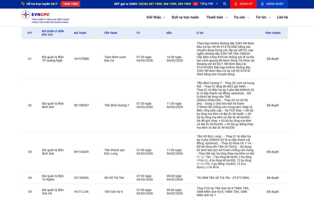 | 3 | Đội quản lý điện Bình Sơn | BH134429 | TBA khách sạn Đức Long | 07:30 04/02/2026 | 11:30 04/02/2026 | TBA KS Đức Long: -