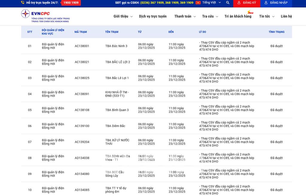 | 10 | Đội quản lý điện Đồпg Hới | AD134085 | TBA TT Y tế dự phòng ĐH | 06:00 23/12/2025 | 11:00 23/12/2025 | - Thay CSV đầu cáp ngầm cả 2 mạch 473&474 tại vị trí C85, và C86 mạch kép 473/474 DHO | Đã duyệt |