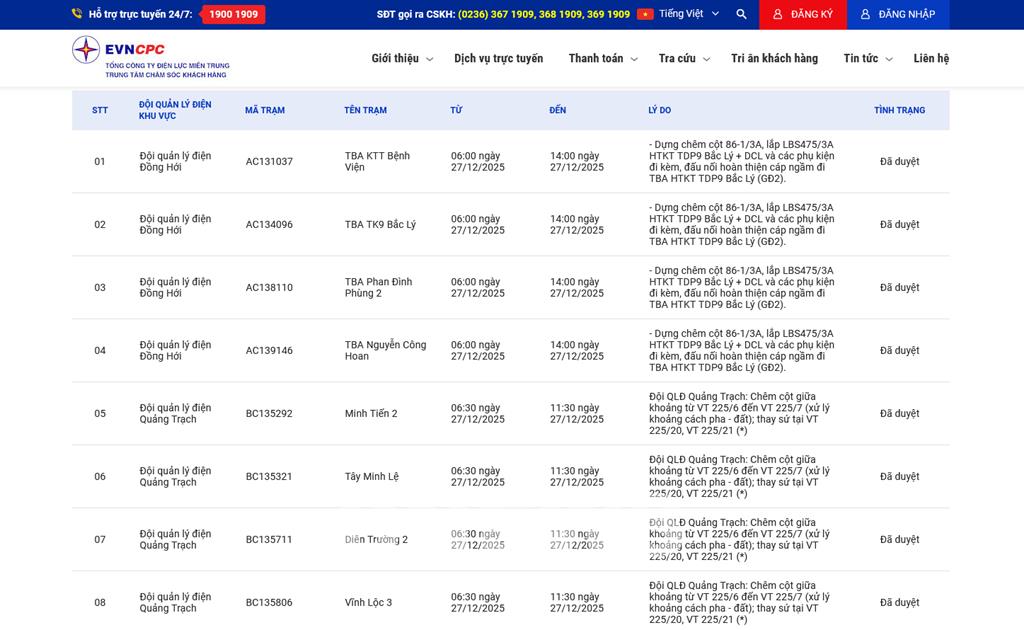 | 4 | Đội quản lý điện Đồпg Hới | AC139146 | TBA Nguyễn Công Hoan | 06:00 27/12/2025 | 14:00 27/12/2025 | - Dựng chêm cột 86-1/3A, lắp LBS475/3A HTKT TDP9 Bắc Lý + DCL và các phụ kiện đi kèm, đấu nối hoàn thiện cáp ngầm đi TBA HTKT TDP9 Bắc Lý (GĐ2). | Đã duyệt |
