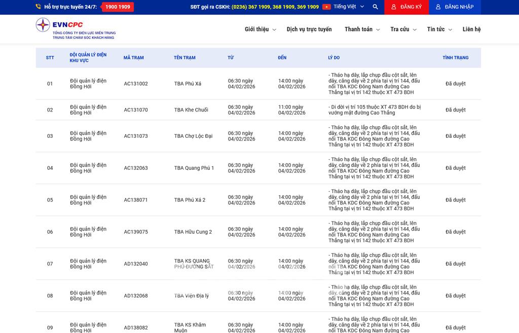| 7 | Đội quản lý điện Đồпg Hới | AD132040 | TBA KS QUANG PHÚ-ĐƯỜNG SẮT | 06:30 04/02/2026 | 14:00 04/02/2026 | - Tháo hạ dây, lắp chụp đầu cột sắt, lên dây, căng dây về 2 phía tại vị trí 144, đấu nối TBA KDC Đông Nam đường Cao Thắng tại vị trí 142 thuộc XT 473 BDH | Đã duyệt |