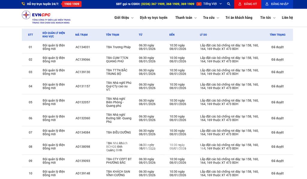 | 10 | Đội quản lý điện Đồпg Hới | AD139148 | TBA KHÁCH SẠN VĨNH CƯỜNG | 06:30 08/01/2026 | 10:30 08/01/2026 | Lắp đặt các bộ chống rơi dây: tại 158, 160, 164, 169 thuộc XT 473 BDH | Đã duyệt |
