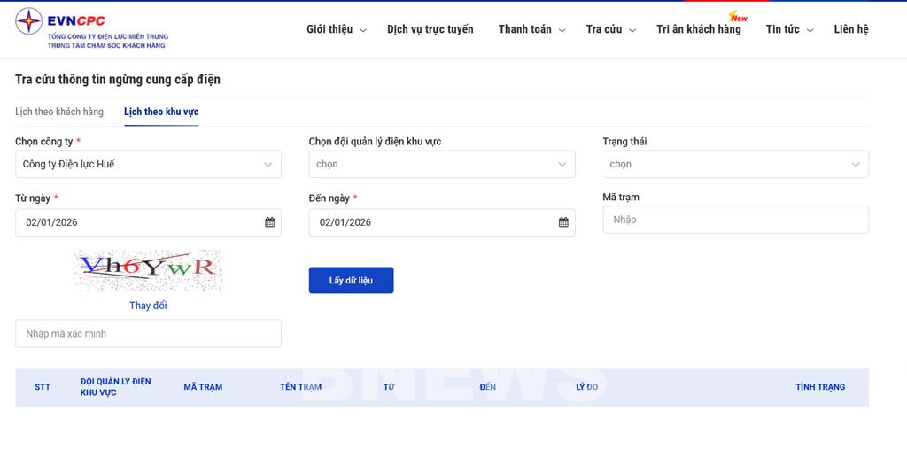 Công ty Điện lực Huế thông báo lịch tạm ngừng cung cấp điện (lịch cúp điện Huế, lịch ngừng cung cấp điện thành phố Huế) hôm nay và ngày 2/1/2026 cập nhật mới nhất như sau: