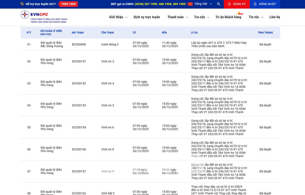 | 8 | Đội quản lý điện Phú Vang | DC530162 | Vinh Mỹ 5 | 07:00 26/12/2025 | 15:00 26/12/2025 | Thay cột, thay dây, xà sứ từ vị trí 338/9 đến vị trí 294/13-2/15 XT 477 Vinh Thanh (471 Vinh Thanh cũ)