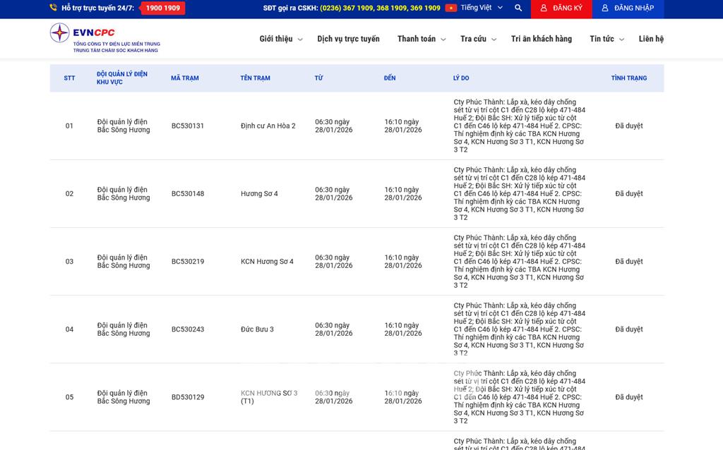| 9 | Đội quản lý điện Nam Sông Hương | AC530274 | Tạm Giam Ngũ Tây | 07:00 28/01/2026 | 08:15 28/01/2026 | Tách lèo vị trí 58 ĐD 22kV tuyến 479 Huế 220 | Đã duyệt |