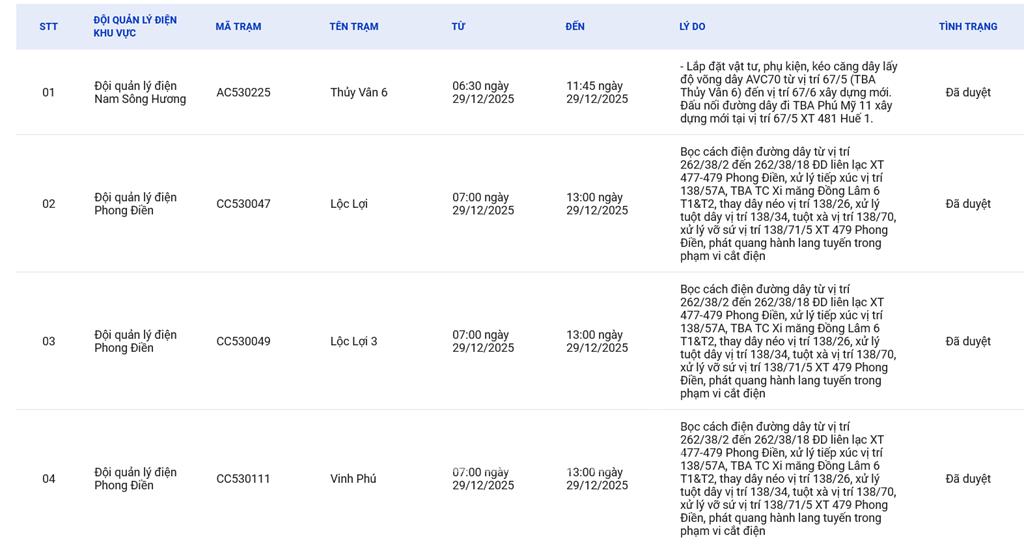 | 4 | Đội quản lý điện Phong Điền | CC530111 | Vinh Phú | 07:00 29/12/2025 | 13:00 29/12/2025 | Bọc cách điện đường dây từ vị trí 262/38/2 đến 262/38/18 ĐD liên lạc XT 477-479 Phong Điền, xử lý tiếp xúc vị trí 138/57A, TBA TC Xi măng Đồng Lâm 6 T1&T2, thay dây néo vị trí 138/26, xử lý tuột dây vị trí 138/34, tuột xà vị trí 138/70, xử lý vỡ sứ vị trí 138/71/5 XT 479 Phong Điền, phát quang hành lang tuyến trong phạm vi cắt điện | Đã duyệt |