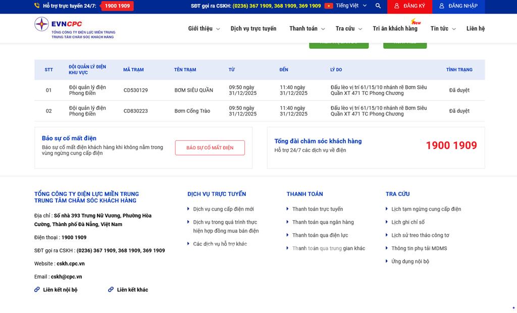 | 2 | Đội quản lý điện Phong Điền | CD830223 | Bơm Cống Trào | 09:50 31/12/2025 | 11:40 31/12/2025 | Đấu lèo vị trí 61/15/10 nhánh rẽ Bơm Siêu Quần XT 471 TC Phong Chương | Đã duyệt |
