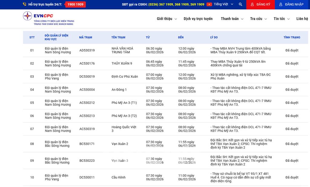 Công ty Điện lực Huế thông báo lịch tạm ngừng cung cấp điện (lịch cúp điện Huế, lịch ngừng cung cấp điện thành phố Huế) hôm nay và ngày 6/2/2026 cập nhật mới nhất như sau: