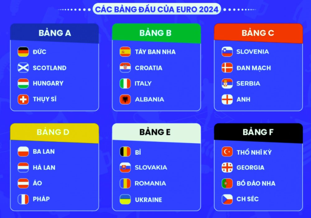 Vòng chung kết Euro 2024 diễn ra tại Đức từ 15/6 đến 15/7. Giải gồm 24 đội chia thành 6 bảng, hai đội dẫn đầu mỗi bảng và bốn đội xếp thứ ba có thành tích tốt nhất sẽ vào vòng 1/8.