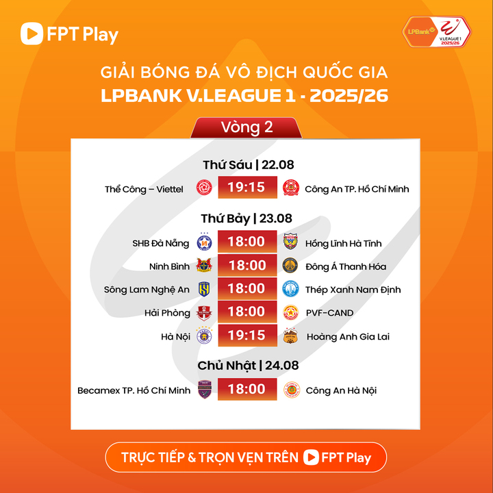 | 22/8 | FPT Play, HTV Thể thao | Thể Công Viettel vs CA TP.HCM |