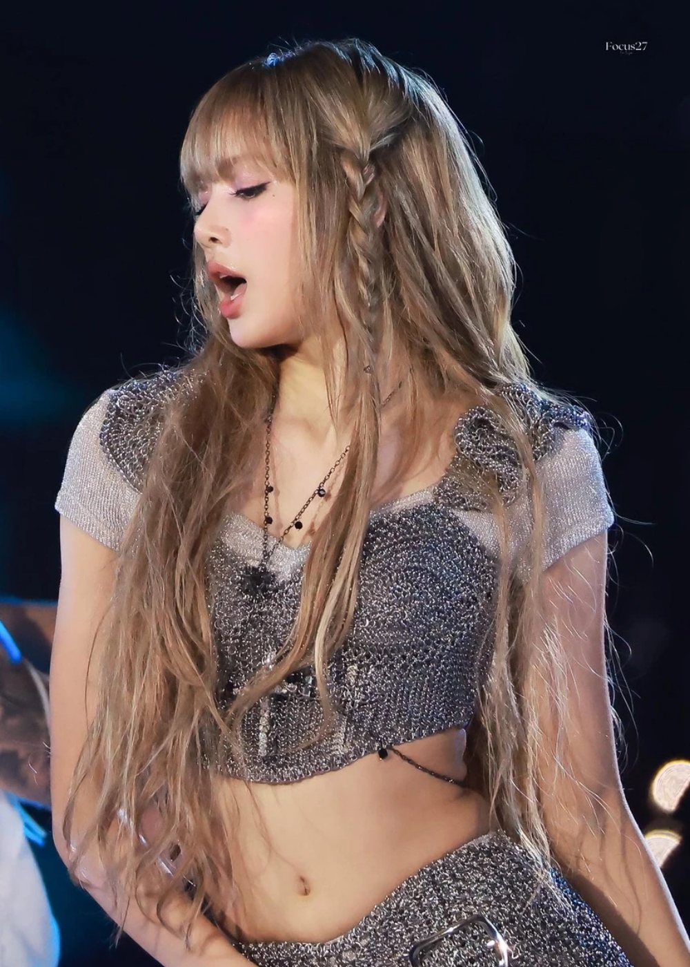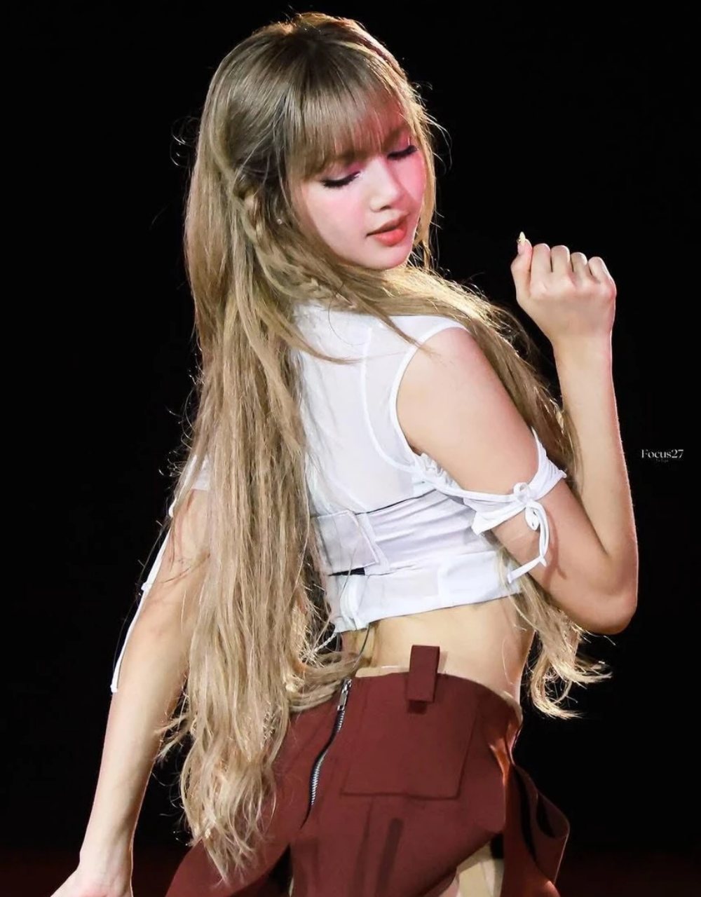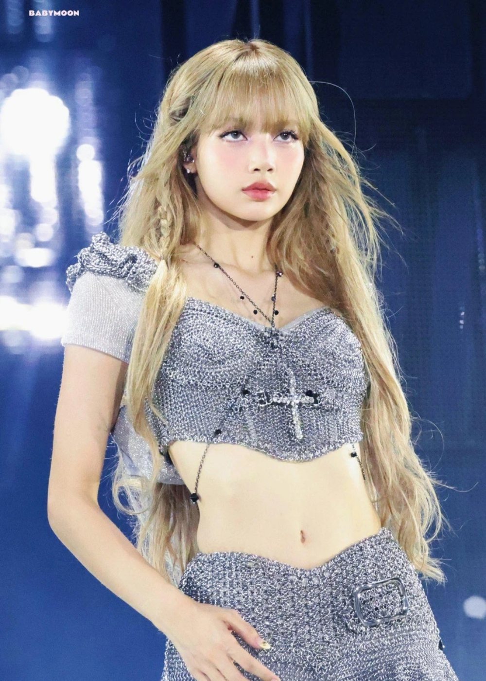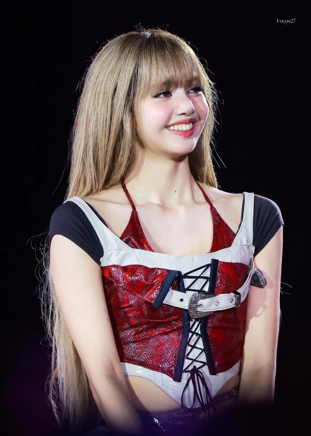 Kiểu tóc mái bằng màu vàng kim, kết hợp lớp trang điểm tông hồng làm nổi bật nét trẻ trung, tươi tắn của nữ idol sinh năm 1997. Trang phục áo crop top kết hợp quần short, chân váy ngắn ôm sát chất liệu sequin hoặc nhấn nhá da bóng làm tôn lên lợi thế vóc dáng. Tạo hình này mang đến hình ảnh một Lisa đậm chất girl crush, vừa mạnh mẽ, cá tính nhưng vẫn không kém phần uyển chuyển, quyến rũ.
