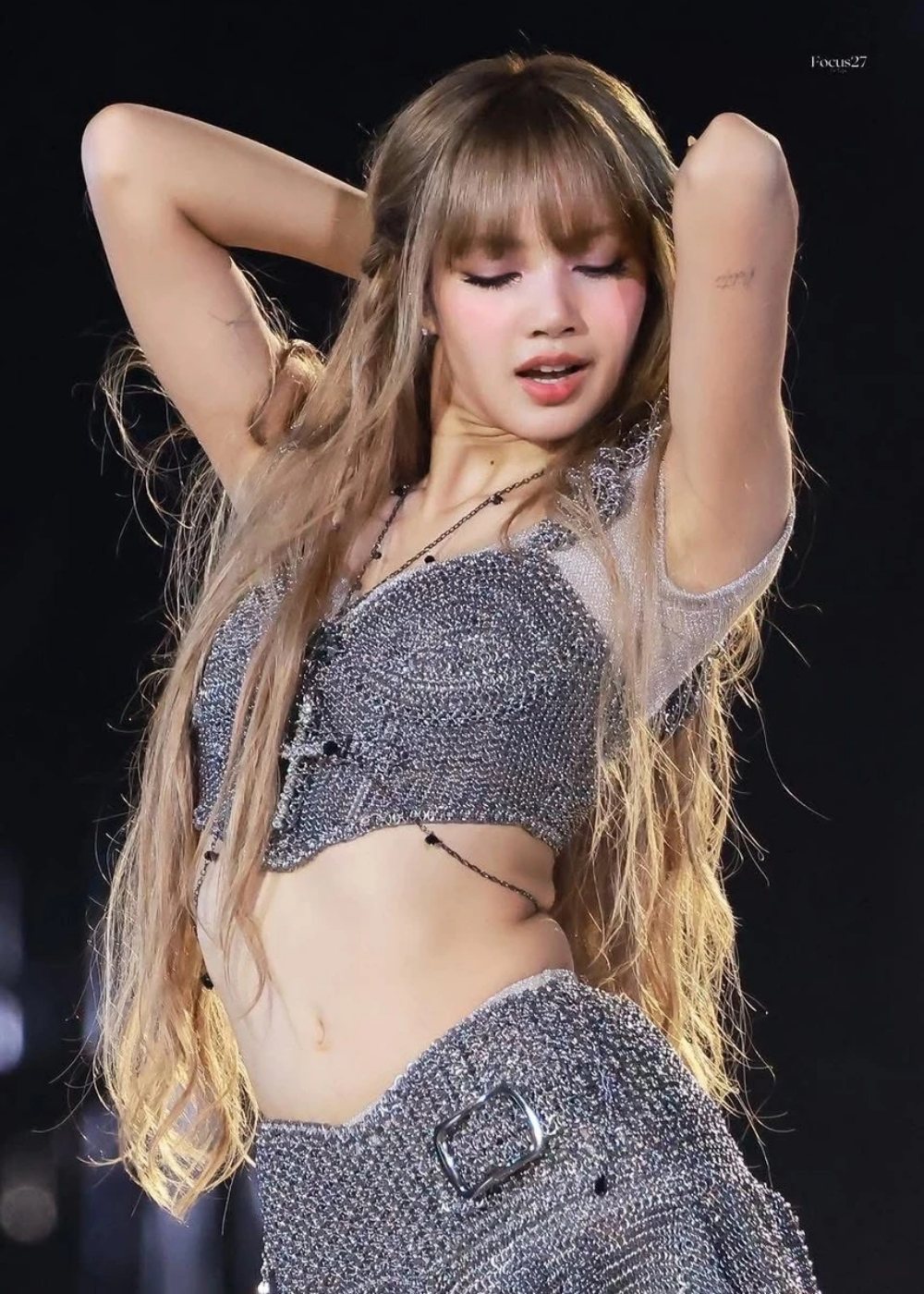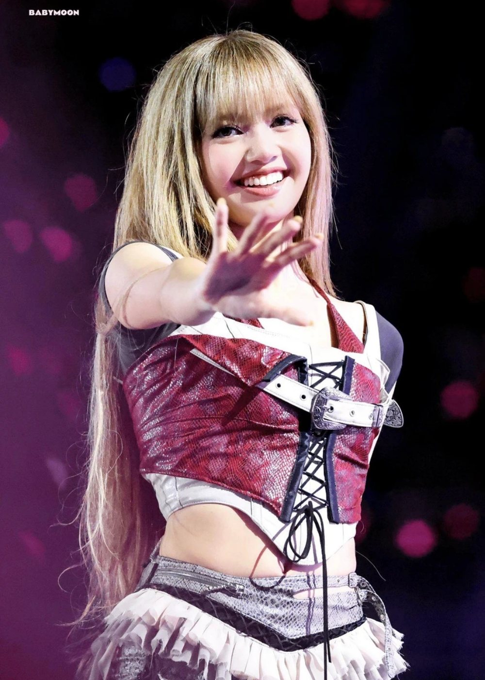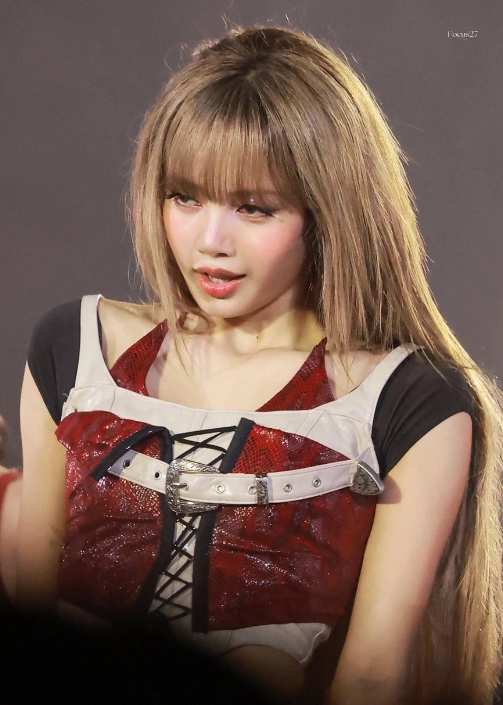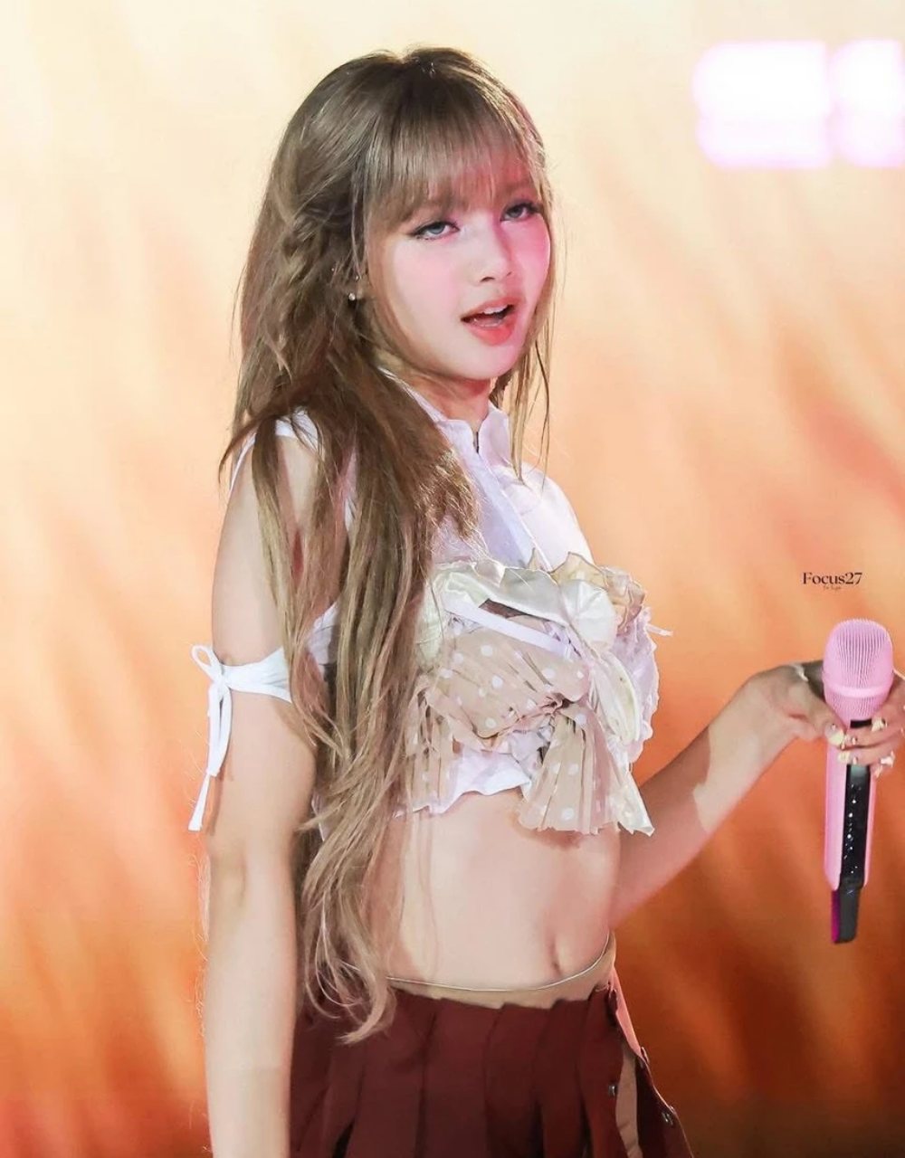 Kiểu tóc mái bằng màu vàng kim, kết hợp lớp trang điểm tông hồng làm nổi bật nét trẻ trung, tươi tắn của nữ idol sinh năm 1997. Trang phục áo crop top kết hợp quần short, chân váy ngắn ôm sát chất liệu sequin hoặc nhấn nhá da bóng làm tôn lên lợi thế vóc dáng. Tạo hình này mang đến hình ảnh một Lisa đậm chất girl crush, vừa mạnh mẽ, cá tính nhưng vẫn không kém phần uyển chuyển, quyến rũ.