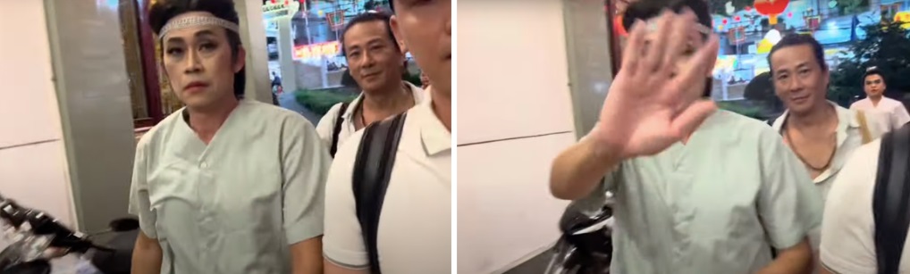 Nghệ sĩ Hoài Linh xua tay khi bị YouTuber quay ghi hình; đây là lần đầu nghệ sĩ xuất hiện sau tin đồn thất thiệt về sức khỏe.