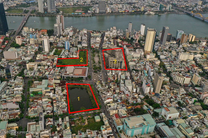 Ba dự án Đà Nẵng Center (số 1), Diamond Square (số 2) và Khu phức hợp thương mại, văn phòng, khách sạn, chung cư cao cấp Golden Square (số 3) bỏ hoang giữa trung tâm Đà Nẵng hơn 15 năm qua. Ảnh: Nguyễn Đông