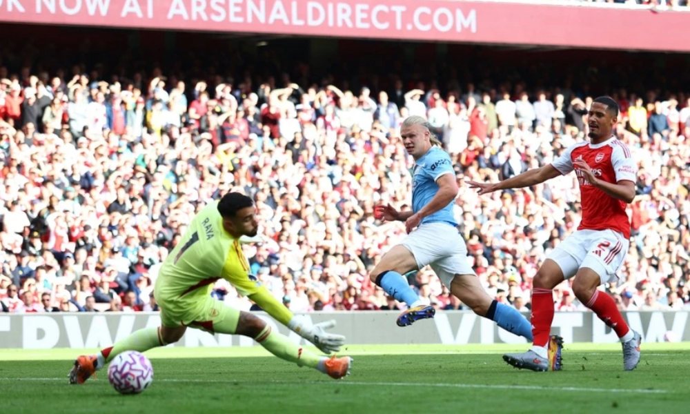 Trong khi còn đang loay hoay tìm phương án tiếp cận khung thành của Gianluigi Donnarumma, chủ nhà bị dội gáo nước lạnh là bàn thua ở phút thứ 9. Erling Haaland châm ngòi cho một đợt phản công của Man City. Cũng chính anh băng lên, đón đường chuyền của Tijjani Reijnders rồi dứt điểm chéo góc, hạ David Raya trong pha đối mặt. Gabriel đã lao lên quá cao, để lộ khoảng trống thênh thang cho một trong những trung phong hay nhất thế giới hiện tại.