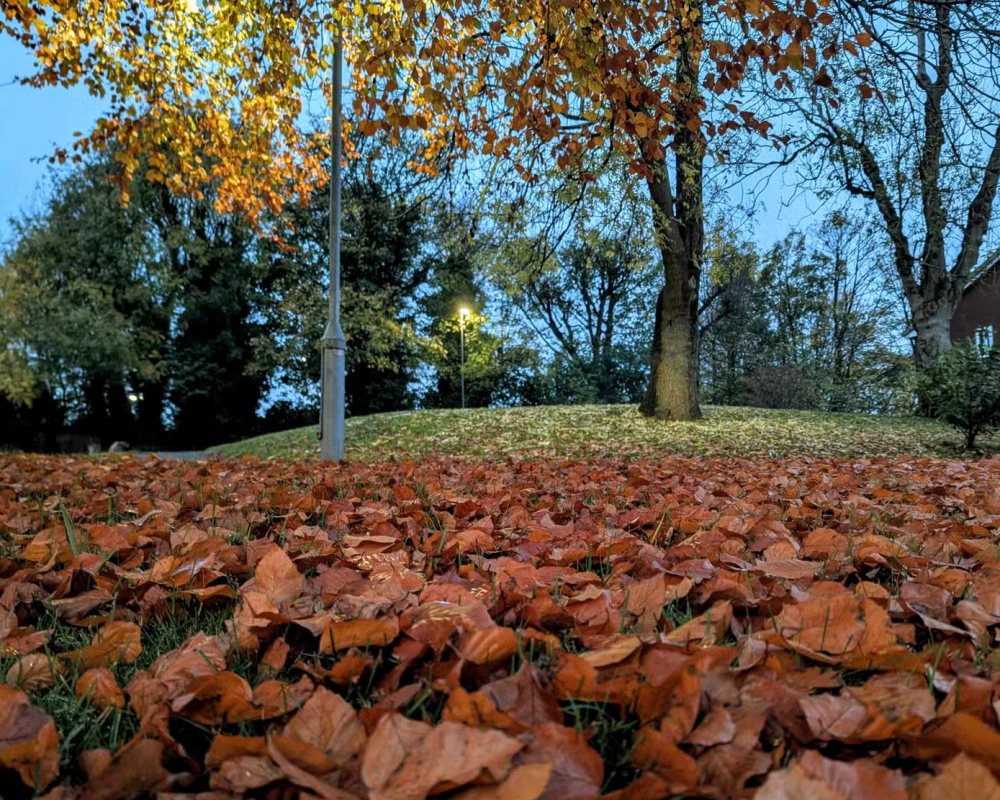 Đừng nghĩ những chiếc lá rụng này chỉ thêm kết cấu và màu sắc; chúng có thể là chủ thể chính trong bức ảnh của bạn. Để chứng minh, bức ảnh ở trên thực sự không có chủ thể, vì nó chỉ là một mảnh đất trống với một vài cái cây và một ngọn đèn đường. Nhưng bằng cách lấp đầy một nửa khung hình bằng lá rụng, nó đột nhiên trở thành một bức ảnh thú vị.