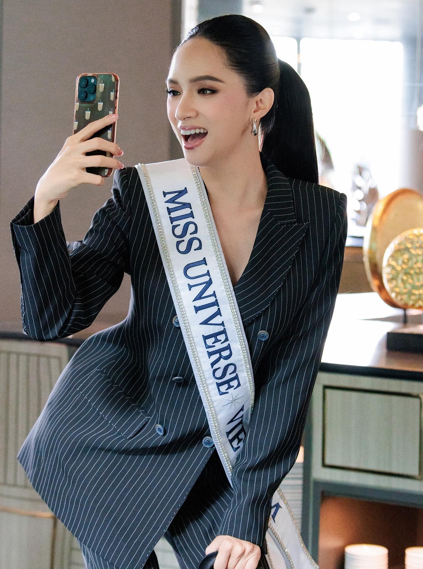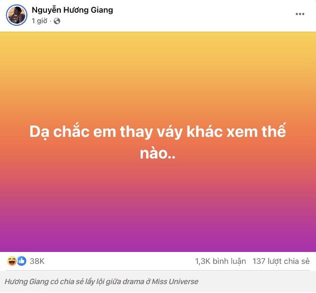 Trên trang cá nhân, đại diện Việt Nam – Hoa hậu Hương Giang – gây chú ý khi đăng dòng trạng thái hài hước giữa lúc drama nổ ra: