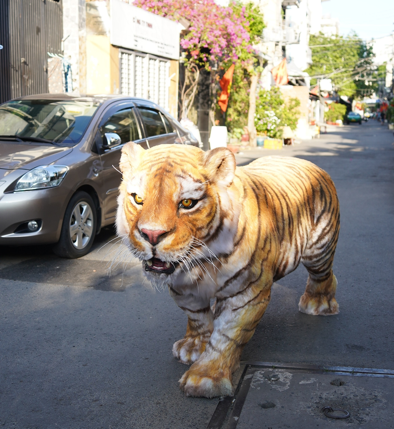 Hình ảnh con hổ giả to lớn với vẻ mặt hung dữ, đang nhe nanh xuất hiện trong một hẻm nhỏ tại TPHCM khiến người đi đường, cộng đồng mạng tò mò thích thú.