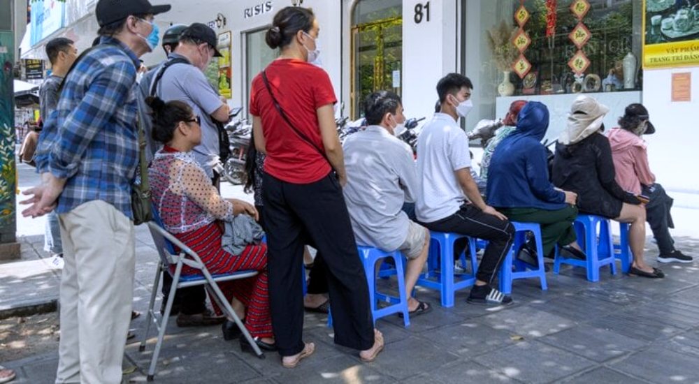 Tại Hà Nội, trước một điểm bán vàng của Ngân hàng Vietinbank (81 Phố Huế, quận Hai Bà Trưng), hàng chục người dân xếp hàng từ sớm để chờ mua vàng, bất chấp thời tiết nắng nóng.