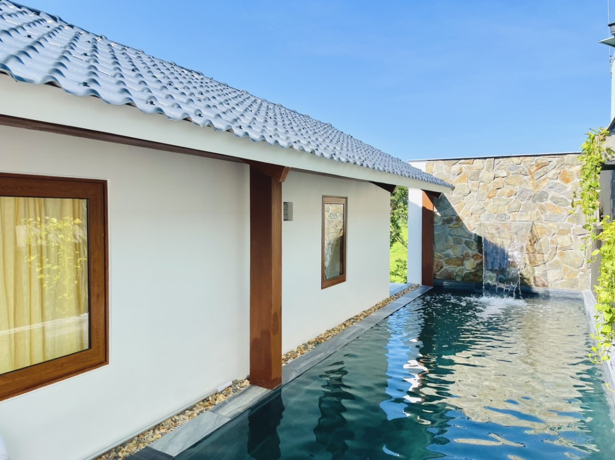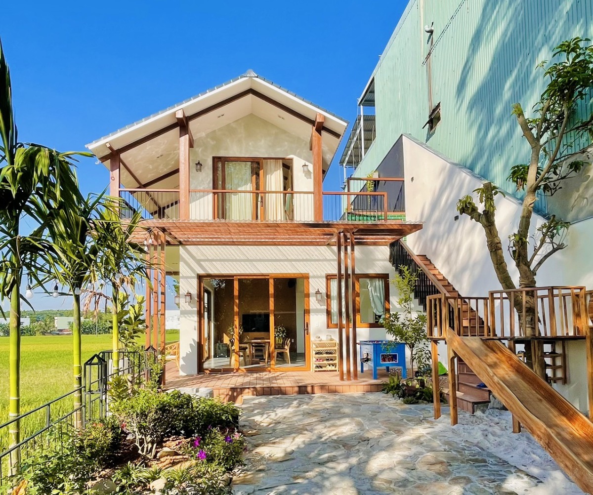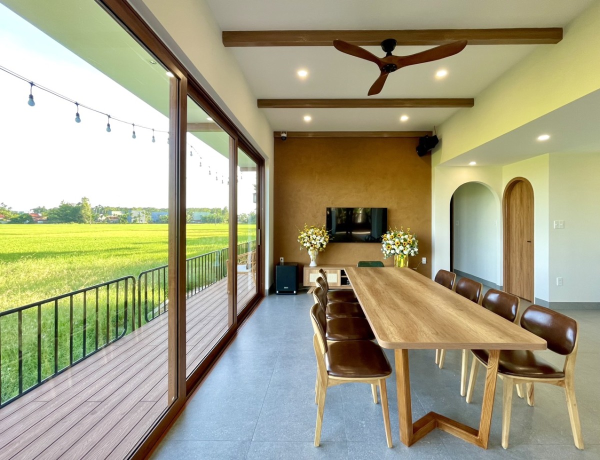Từng phải cách ly trong ngôi nhà ống chật hẹp giai đoạn dịch Covid-19, gia chủ mong muốn xây dựng một không gian sống mộc mạc, gần gũi với thiên nhiên. Công trình mang nét văn hóa vùng Tam Kỳ, bao quanh bởi cánh đồng lúa xanh ngát và hàng cây sưa nở hoa vàng li ti.