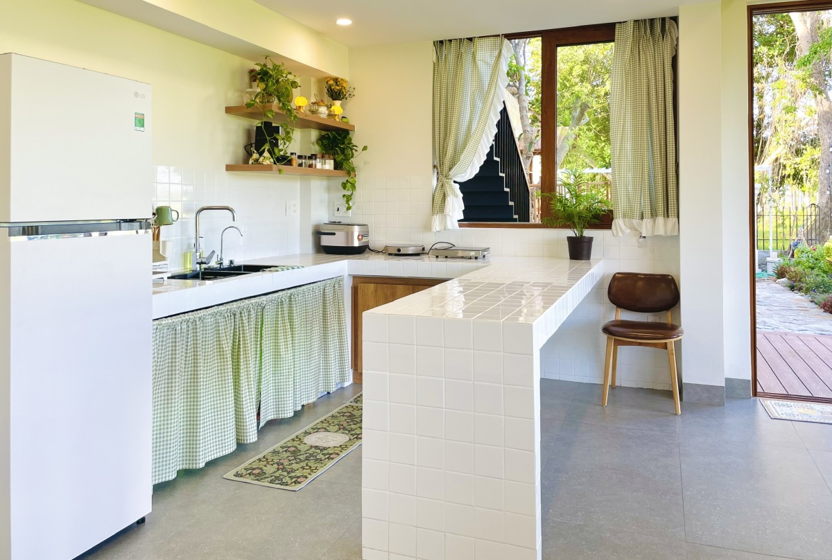 Phòng bếp được mang ra trước nhà, mở cửa sổ lớn hướng ra sân trước để thoát mùi. Bàn bếp được xây cố định, bề mặt ốp gạch men trắng, dễ vệ sinh.